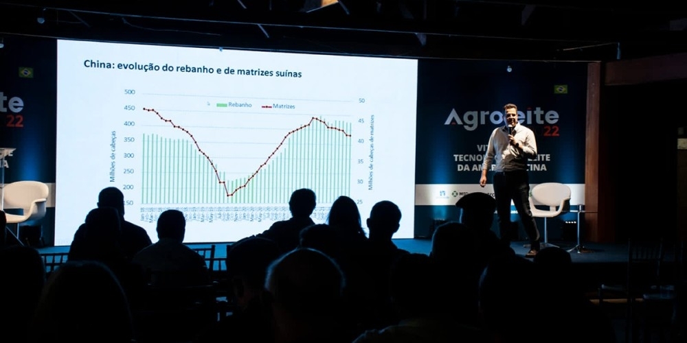 O palestrante Vitor Vernizzi, especialista no mercado das commodities, trouxe para o evento uma visão macro dos acontecimentos mundiais e como isso impacta na produção e venda dos produtos suinícolas. “É preciso trazer estas informações para o produtor pois, com a globalização, o Brasil está cada vez mais inserido no mercado internacional. Estamos exportando mais, e saber o que está acontecendo por lá é essencial para o planejamento. O produtor sabe que está no lugar correto e, atualmente, o mercado é muito competitivo. Apesar da pandemia e guerras, conseguimos abrir mais espaço para a exportação”.